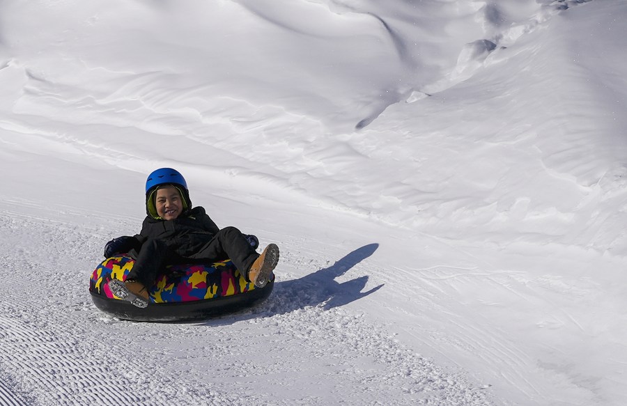 A kid slides on the snow at a ski resort on the suburbs of Urumqi, northwest China's Xinjiang Uygur Autonomous Region, Jan. 25, 2023. (Xinhua/Zhao Ge)