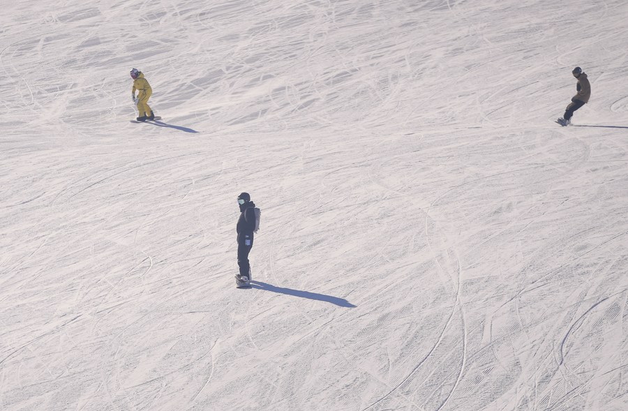 Snowboarders slide at a ski resort on the suburbs of Urumqi, northwest China's Xinjiang Uygur Autonomous Region, Jan. 25, 2023. (Xinhua/Zhao Ge)