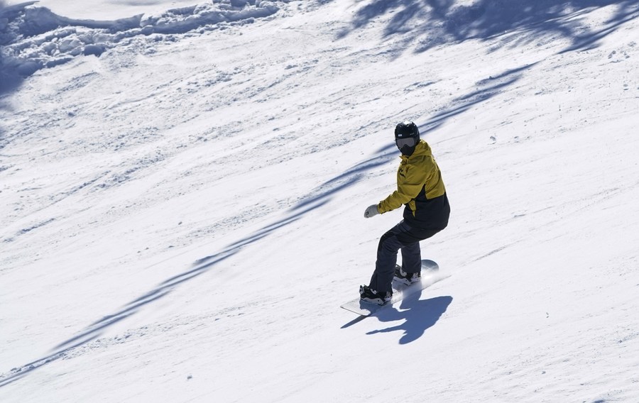 A snowboarder slides down the slope at a ski resort on the suburbs of Urumqi, northwest China's Xinjiang Uygur Autonomous Region, Jan. 25, 2023. (Xinhua/Zhao Ge)