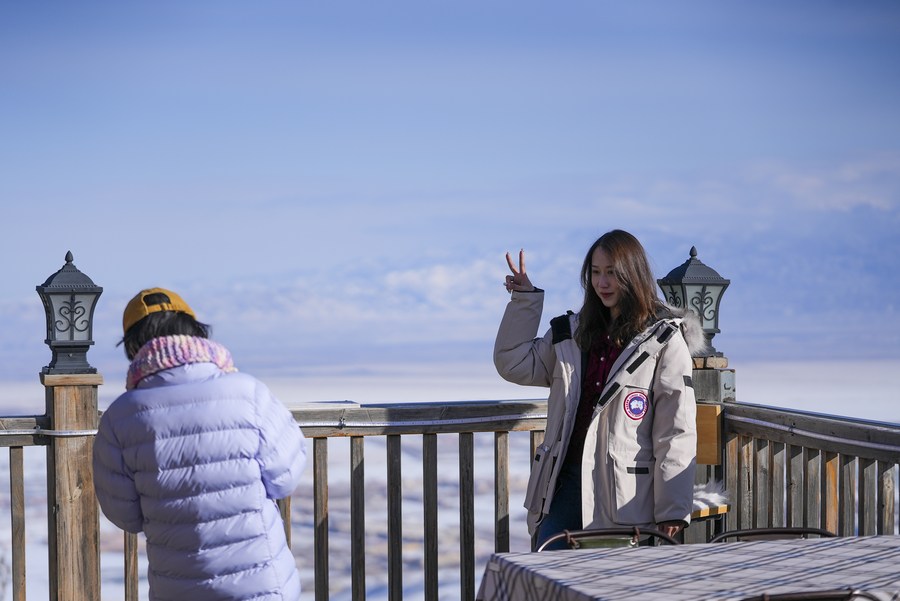 A tourist poses for photos at a ski resort on the suburbs of Urumqi, northwest China's Xinjiang Uygur Autonomous Region, Jan. 25, 2023. (Xinhua/Zhao Ge)