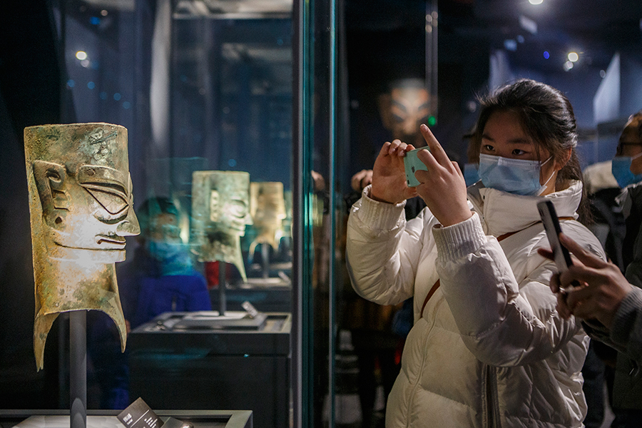 Visitors at a museum in Guanghan, Sichuan province, take photos on Jan 24, 2023 of a gold mask discovered among the Sanxingdui Ruins. [PHOTO by LI DONG/FOR CHINA DAILY]