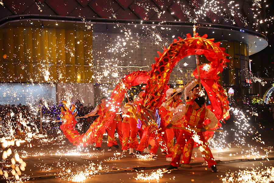 Locals perform a dragon dance during a molten iron firework show to celebrate Spring Festival in Taiyuan, Shanxi province, on Jan 24, 2023. [PHOTO by HU YUANJIA/FOR CHINA DAILY]