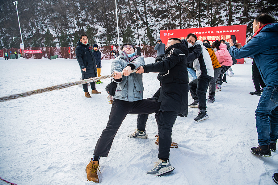 People participate in the snow tug-of-war at the Cuihua Mountain Ski Resort in Xi'an, Shaanxi province, on Jan 10, 2023. [PHOTO by YUAN JINGZHI/FOR CHINA DAILY]