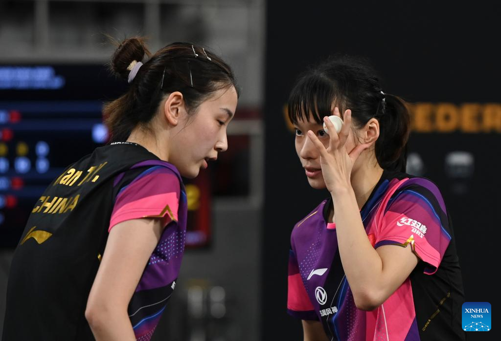 Qian Tianyi(L)/Shi Xunyao of China communicate during the women's doubles final match between Qian Tianyi/Shi Xunyao and Zhang Rui/Kuai Man of China at WTT Feeder Doha 2023 in Doha, Qatar, Jan. 26, 2023. (Photo by Nikku/Xinhua)