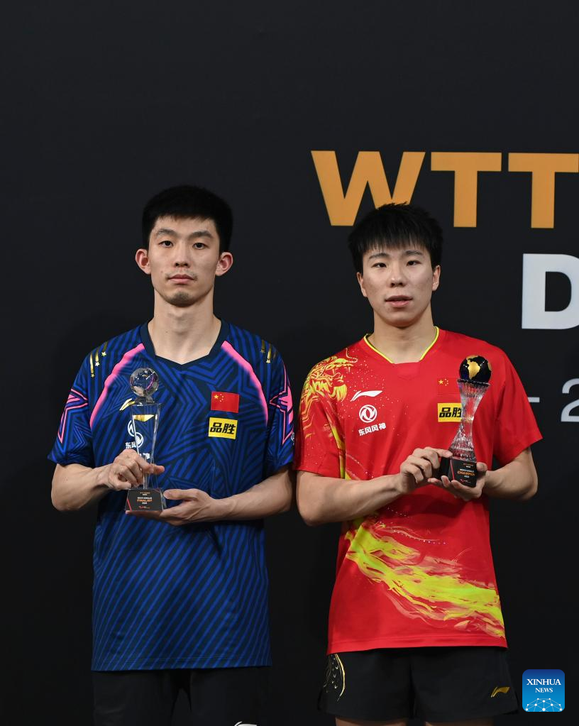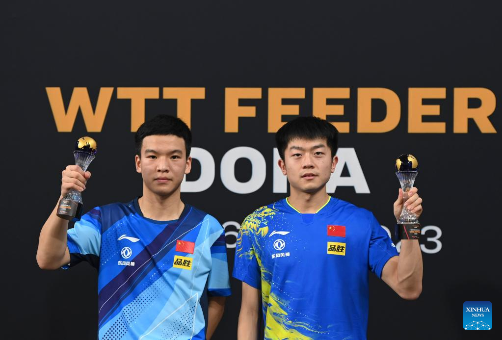 Xu Yingbin (R) and Zhou Kai of China pose with the trophies during the awarding ceremony after their men's singles final match at WTT Feeder Doha 2023 in Doha, Qatar, Jan. 26, 2023. (Photo by Nikku/Xinhua)