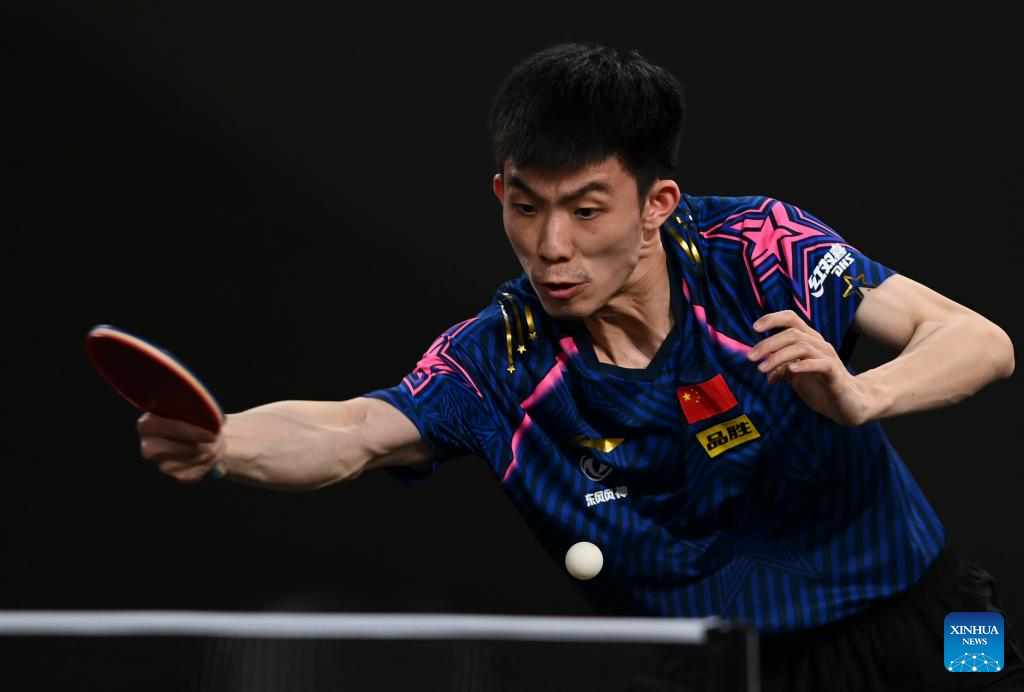 Zhou Kai of China hits a return during the men's singles final match against his compatriot Xu Yingbin at WTT Feeder Doha 2023 in Doha, Qatar, Jan. 26, 2023. (Photo by Nikku/Xinhua)