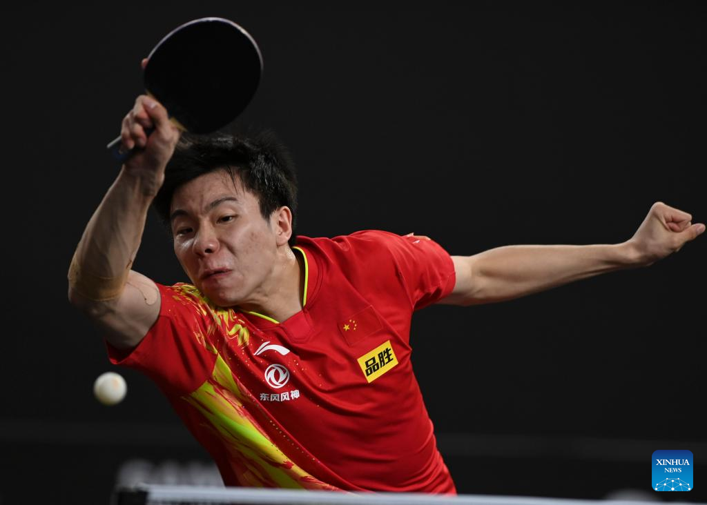 Xu Yingbin of China hits a return during the men's singles final match against his compatriot Zhou Kai at WTT Feeder Doha 2023 in Doha, Qatar, Jan. 26, 2023. (Photo by Nikku/Xinhua)