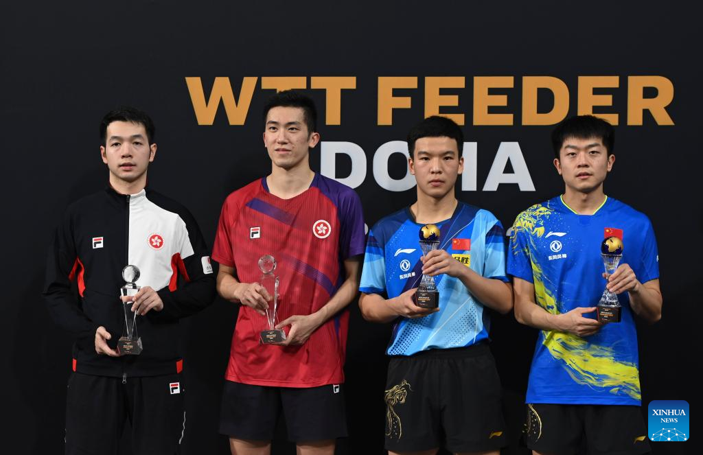 Yuan Licen/Xiang Peng of China and Ho Kwan Kit/Lam Siu Hang of China's Hong Kong pose with the trophies (from R to L) during the awarding ceremony after their men's doubles final match at WTT Feeder Doha 2023 in Doha, Qatar, Jan. 26, 2023. (Photo by Nikku/Xinhua)