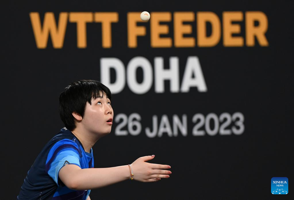 Kuai Man of China serves during the women's singles final match against her compatriot He Zhuojia at WTT Feeder Doha 2023 in Doha, Qatar, Jan. 26, 2023. (Photo by Nikku/Xinhua)
