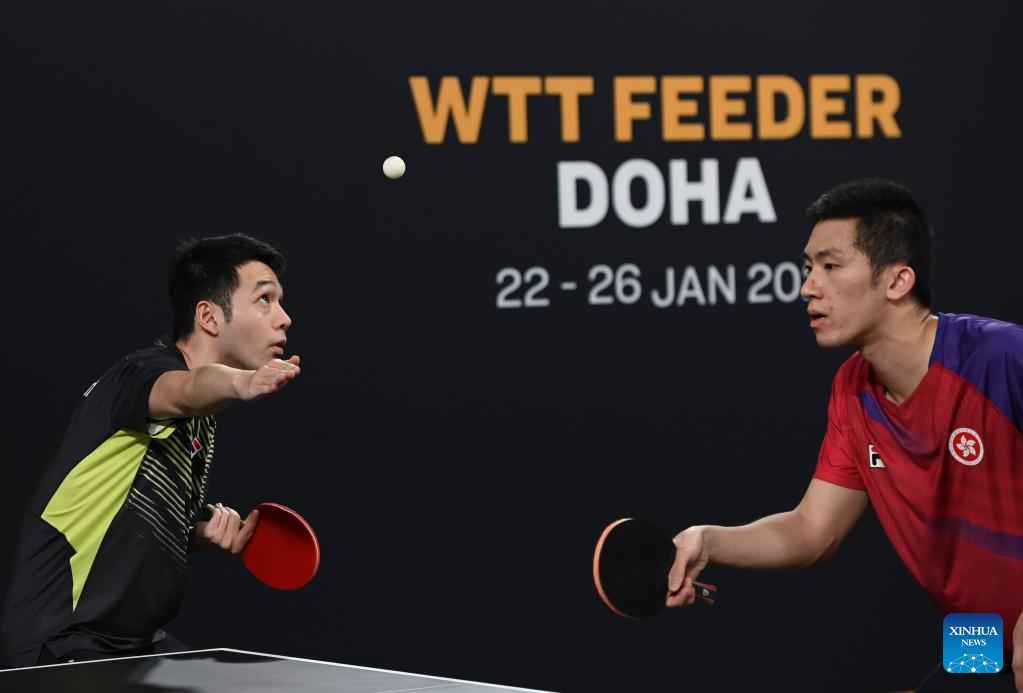 Ho Kwan Kit (L)/Lam Siu Hang of China's Hong Kong compete during the men's doubles final match against Yuan Licen/Xiang Peng of China at WTT Feeder Doha 2023 in Doha, Qatar, Jan. 26, 2023. (Photo by Nikku/Xinhua)