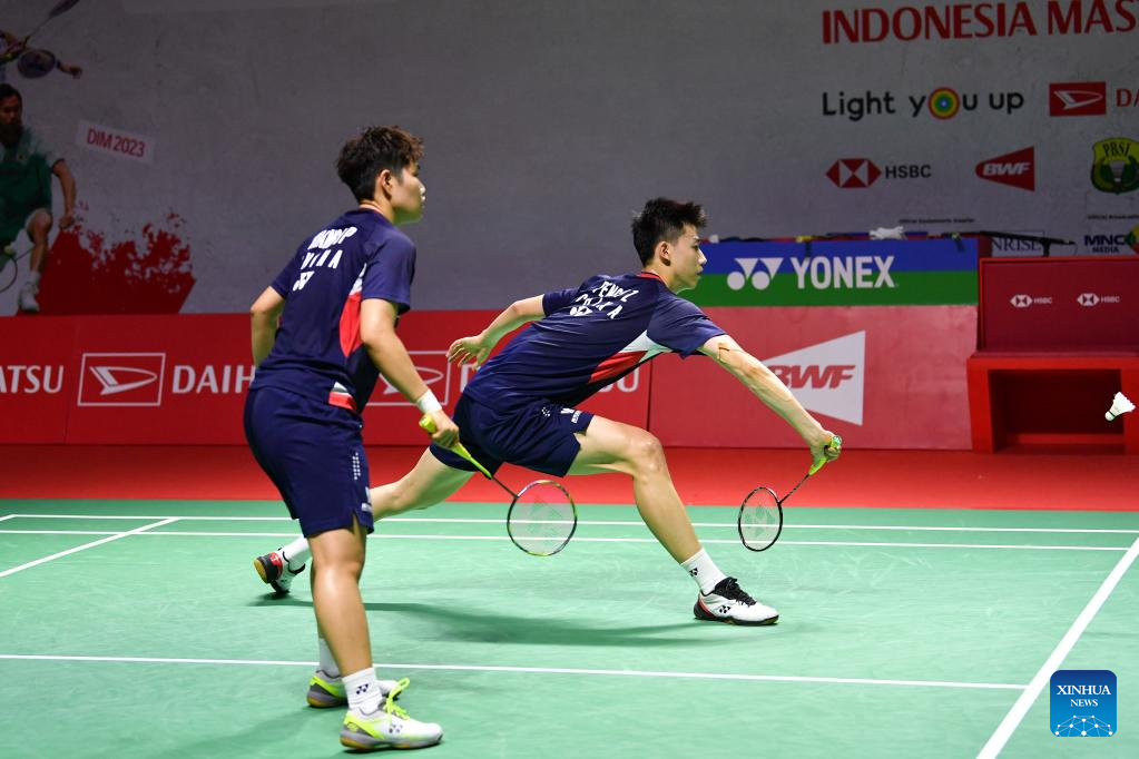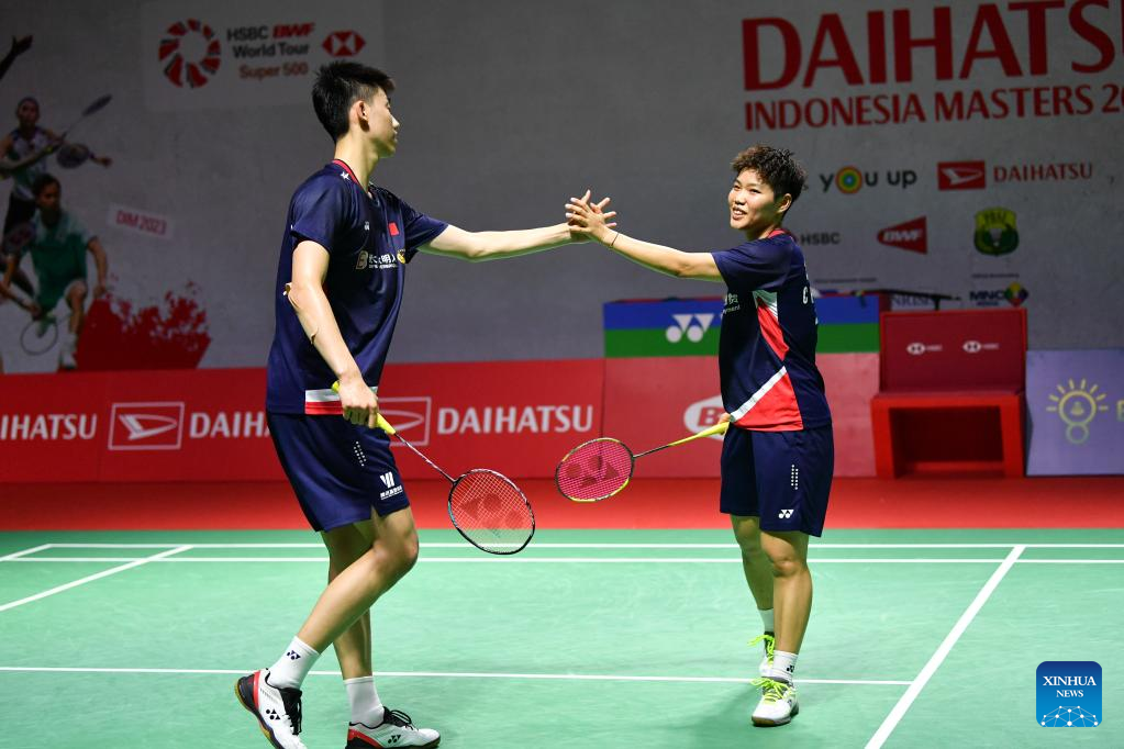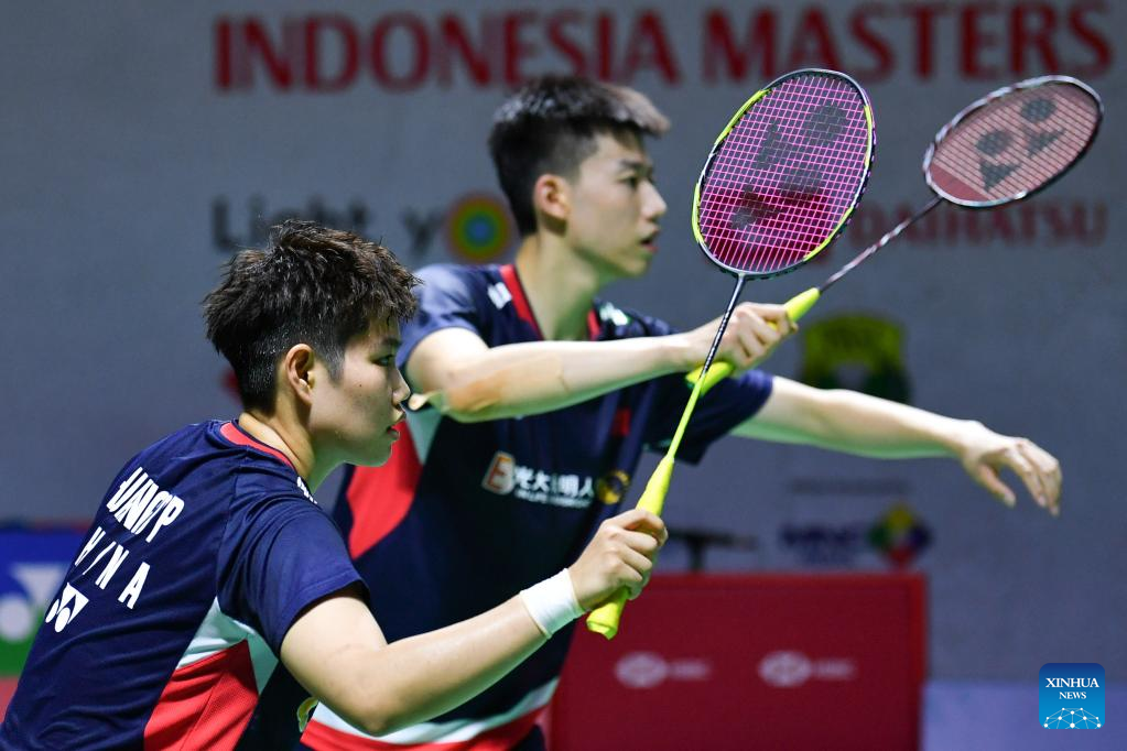 Feng Yanzhe/Huang Dongping (L) of China compete during the mixed doubles quarterfinal match between Jafar Hidayatullah/Aisyah Salsabila Putri Pranata of Indonesia and Feng Yanzhe/Huang Dongping of China at Indonesia Masters 2023 badminton tournament in Jakarta, Indonesia, Jan. 27, 2023. (Xinhua/Xu Qin)