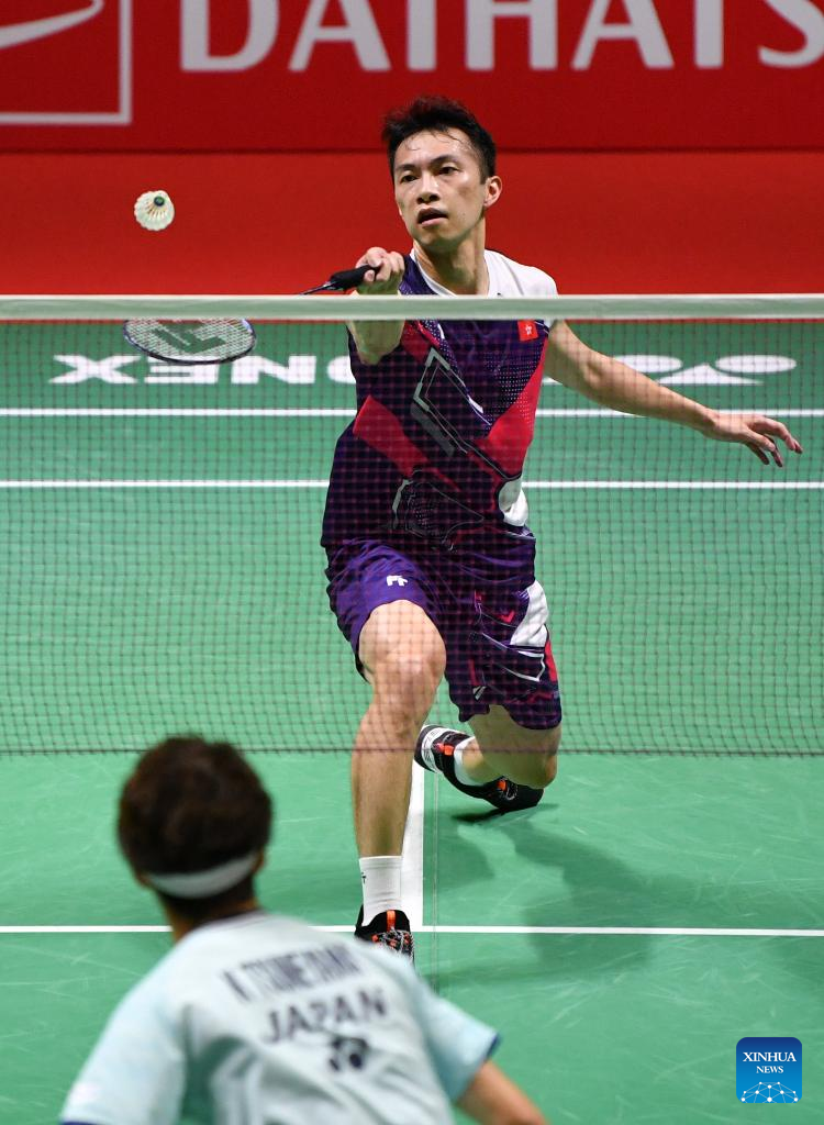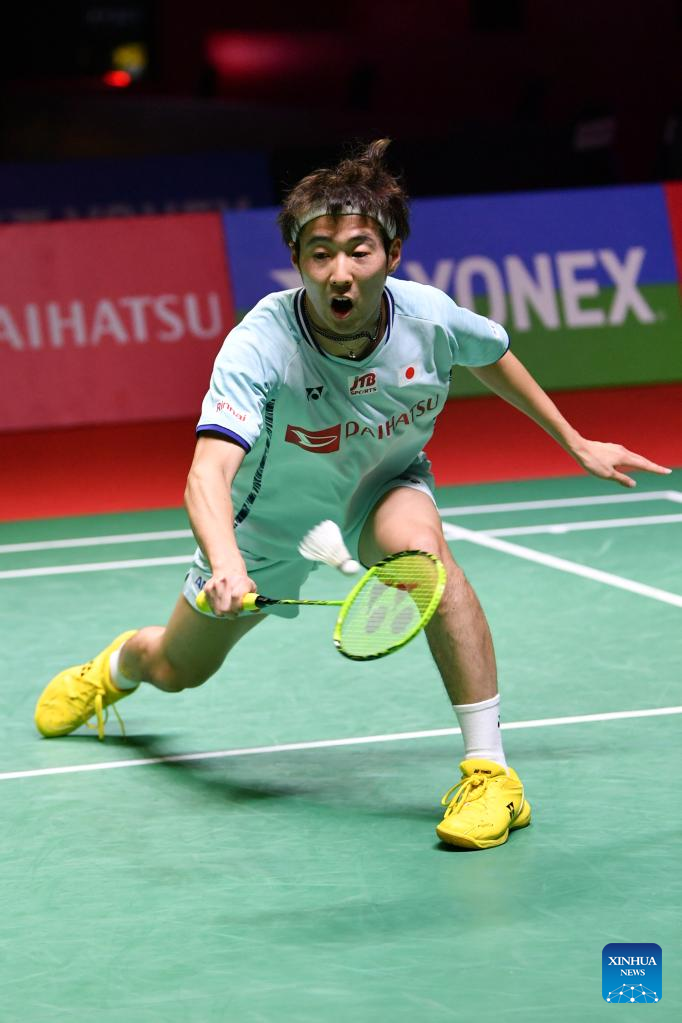 Kanta Tsuneyama of Japan hits a return during the men's singles quarterfinal match between Kanta Tsuneyama of Japan and Ng Ka Long Angus of Hong Kong, China at Indonesia Masters 2023 badminton tournament in Jakarta, Indonesia, Jan. 27, 2023. (Xinhua/Xu Qin)