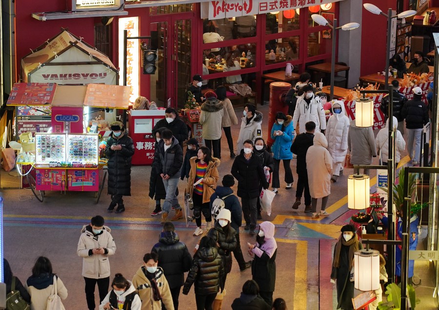 People enjoy leisure time at a business center in Beijing, capital of China, Dec. 25, 2022. (Xinhua/Zhang Chenlin)
