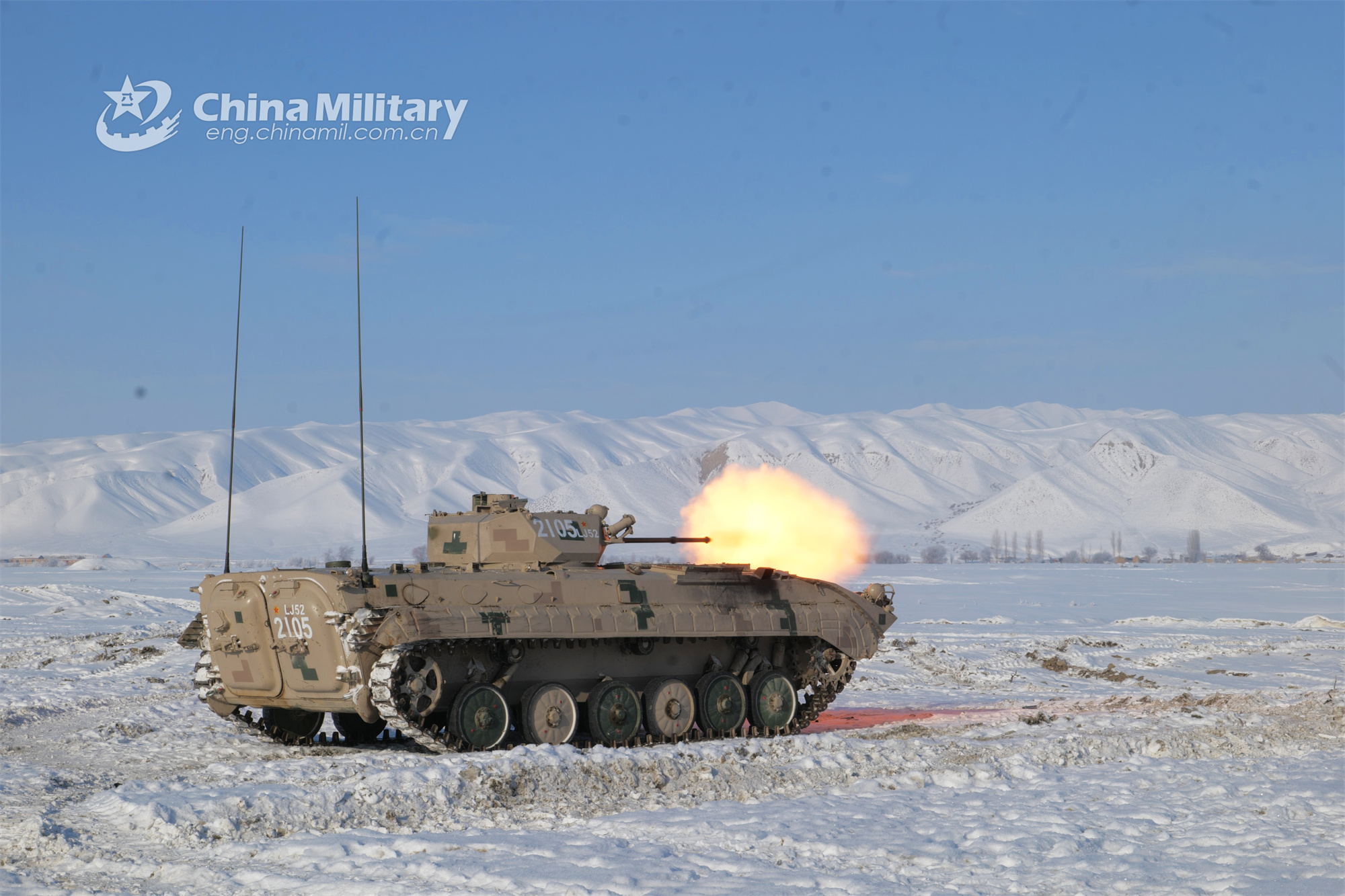 An armored vehicle attached to an army unit under the PLA Xinjiang Military Command fires at a mock target during a training exercise in mid-January, 2023. (eng.chinamil.com.cn/Photo by Lin Jiayu)