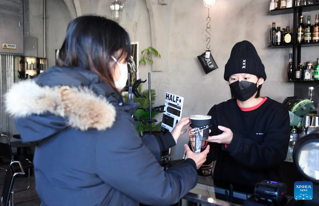 Lu Qi (R) gives the first cup of coffee to a customer on the first working day after the Spring Festival holiday in Dongcheng District of Beijing, capital of China, Jan. 28, 2023. Saturday marked the first day of work after the Spring Festival holiday in China. (Xinhua/Ren Chao)