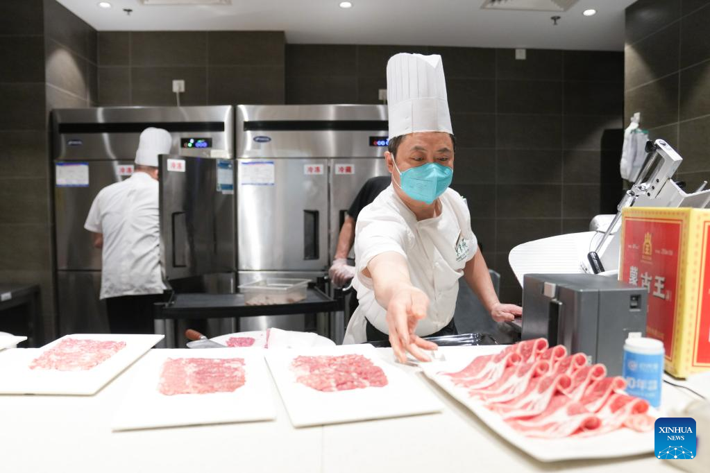 Chef Feng Bingshan (front) slices meat for the first customers at a restaurant on the first working day after the Spring Festival holiday in Beijing, capital of China, Jan. 28, 2023. Saturday marked the first day of work after the Spring Festival holiday in China. (Xinhua/Ju Huanzong)
