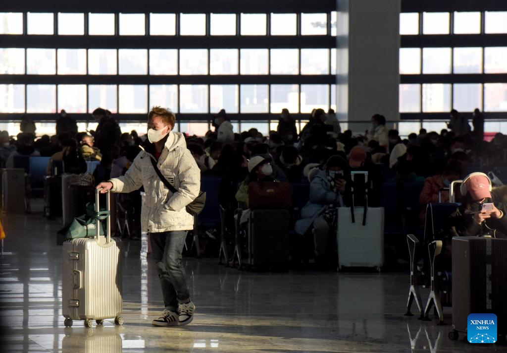 Passengers wait at Fuyang West Railway Station in Fuyang City, east China's Anhui Province, Jan. 27, 2023. Fuyang West Railway Station was bustling with passengers on Friday, the last day of the Spring Festival holiday. As more railway stations have been put into use in the city, more people choose to travel by high-speed train to go to work or visit families. The city has seen a sharp increase in the number of railway passengers. (Xinhua/Guo Chen)