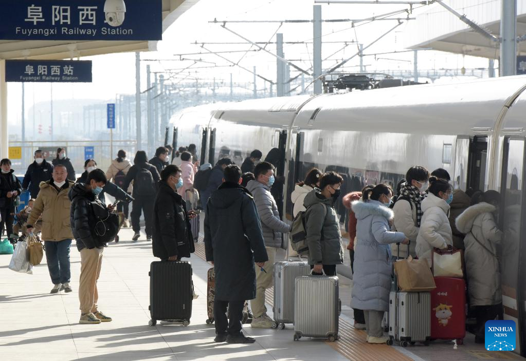 Passengers prepare to board a train at Fuyang West Railway Station in Fuyang City, east China's Anhui Province, Jan. 27, 2023. Fuyang West Railway Station was bustling with passengers on Friday, the last day of the Spring Festival holiday. As more railway stations have been put into use in the city, more people choose to travel by high-speed train to go to work or visit families. The city has seen a sharp increase in the number of railway passengers. (Xinhua/Guo Chen)