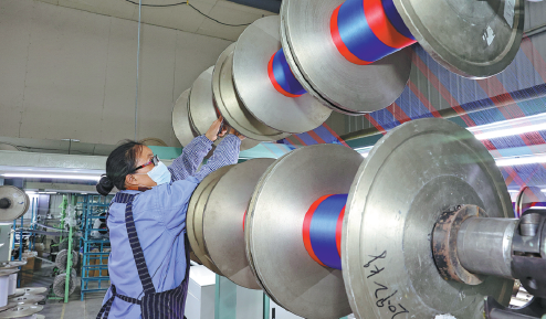 An employee operates a production machine at a workshop of Jiangsu Golden Autumn Elastic Fabrics Co Ltd in Nantong, Jiangsu province, on April 18. The products are for orders to Vietnam, Pakistan and other countries. XU CONGJUN/FOR CHINA DAILY