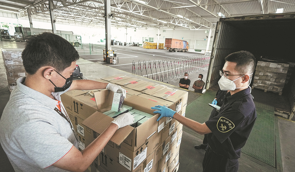 Customs staffers conduct inspections on duty-free goods and check the product information, on Nov 7, 2022. ZHANG MAO/FOR CHINA DAILY