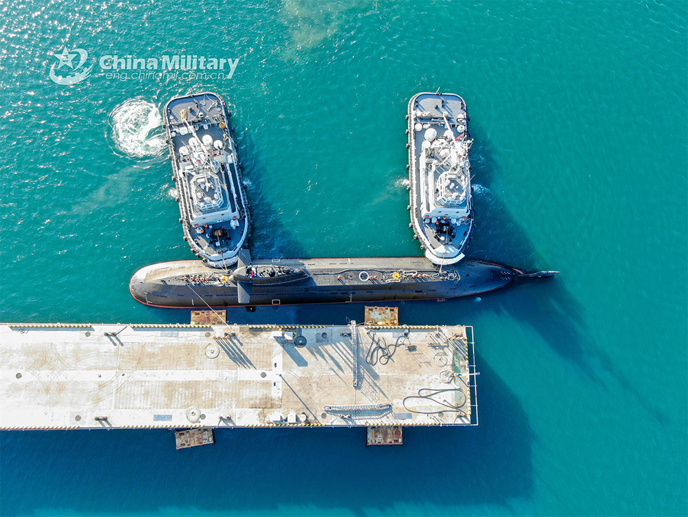 Two tugboats attached to a submarine flotilla with the navy under the PLA Northern Theater Command help a submarine to dock at a port during a combat exercise in January. (eng.chinamil.com.cn/Photo by Wu Haodong)