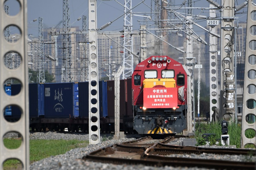 A China-Europe freight train arrives at Xi'an international port in Xi'an, northwest China's Shaanxi Province, Aug. 31, 2022. (Xinhua/Li Yibo)