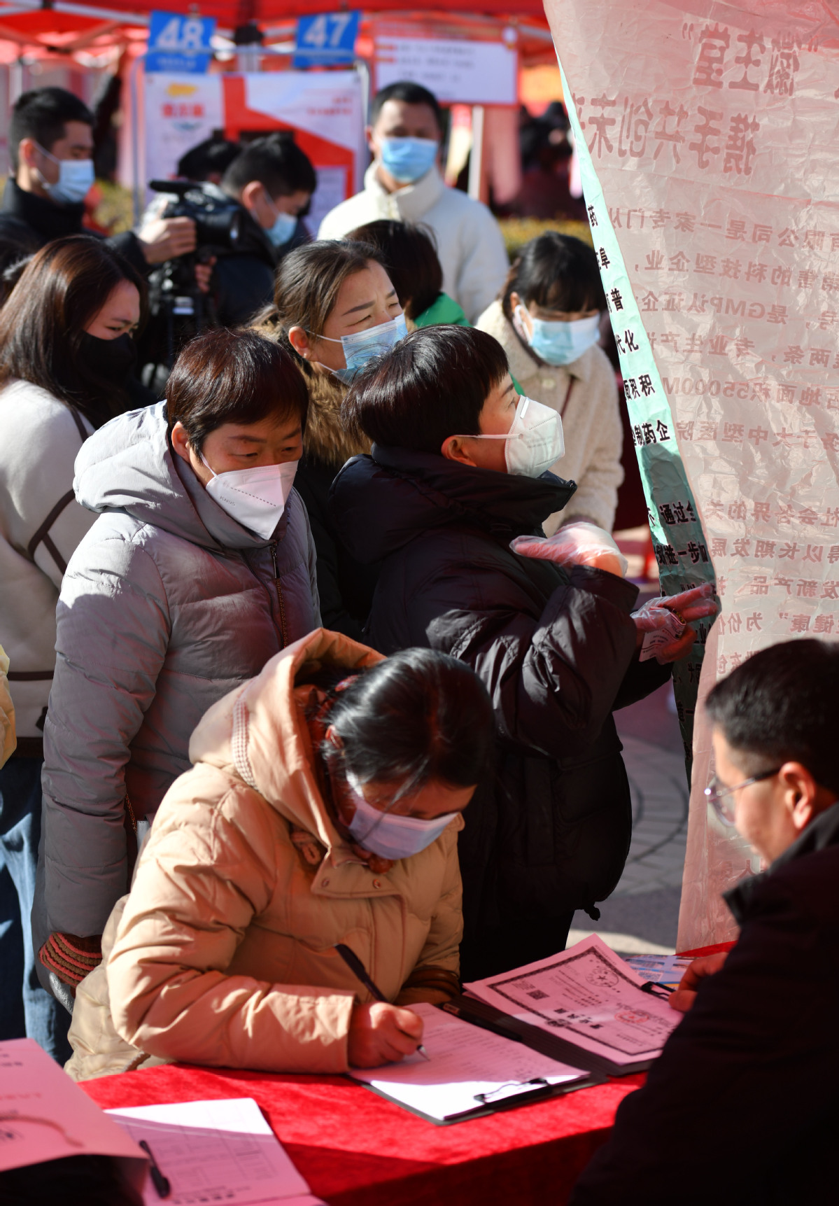 In Suzhou, Jiangsu, some former PCR testing booths for COVID-19 infections have been converted into recruiting stations. Brochures with information such as dates and locations of job fairs are handed out to attract workers. The brochures are also distributed in the city's train stations.