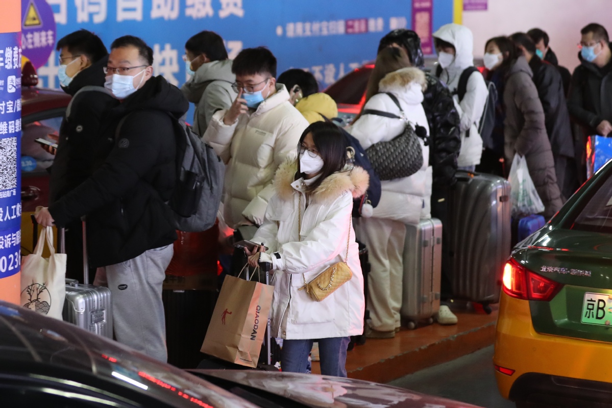 Passengers wait for taxis at Beijing West Railway Station on Jan 27, 2023. [Photo by Wang Zhuangfei/chinadaily.com.cn]