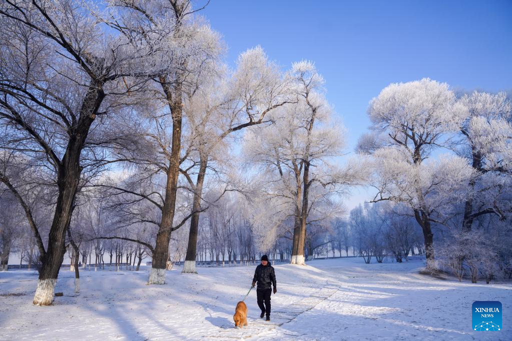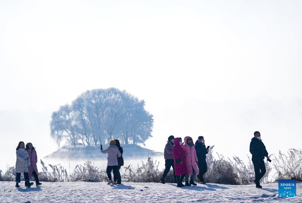 People enjoy the rime scenery near the Songhua River in Jilin City, northeast China's Jilin Province, Jan. 30, 2023. (Xinhua/Yan Linyun)