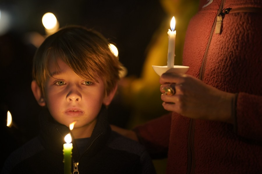 A boy attends a candlelight vigil for victims of the shootings in Half Moon Bay in California, the United States, Jan. 27, 2023. (Xinhua/Wu Xiaoling)