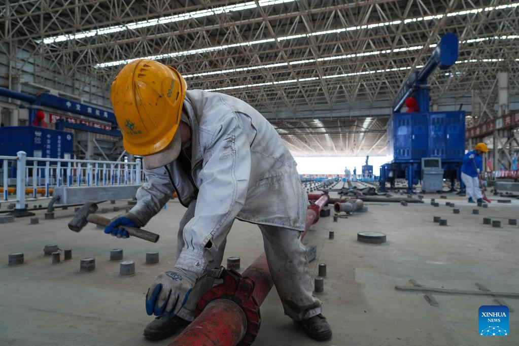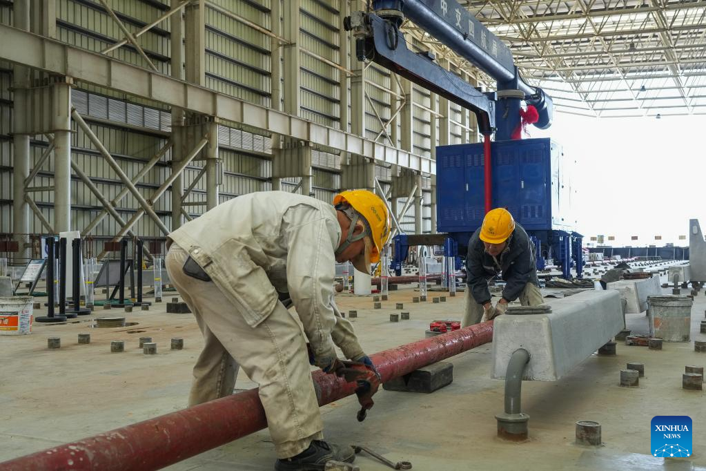 A staff member lays out pipelines before pouring concrete to immersed tube E23 of Shenzhen-Zhongshan highway underwater tunnel at an immersed tube smart factory of CCCC Fourth Harbour Engineering Co., Ltd. on Niutou Island, Zhuhai, south China's Guangdong Province, Jan. 31, 2023. (Xinhua/Liu Dawei)