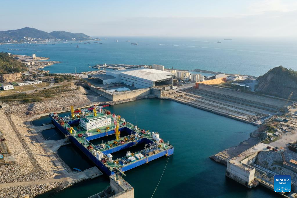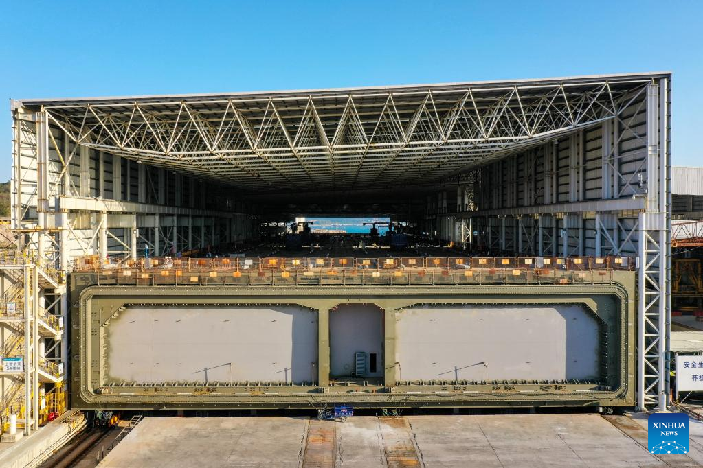 This aerial photo taken on Jan. 30, 2023 shows immersed tube E23 of Shenzhen-Zhongshan highway underwater tunnel at an immersed tube smart factory of CCCC Fourth Harbour Engineering Co., Ltd. on Niutou Island, Zhuhai, south China's Guangdong Province.  (Xinhua/Liu Dawei)