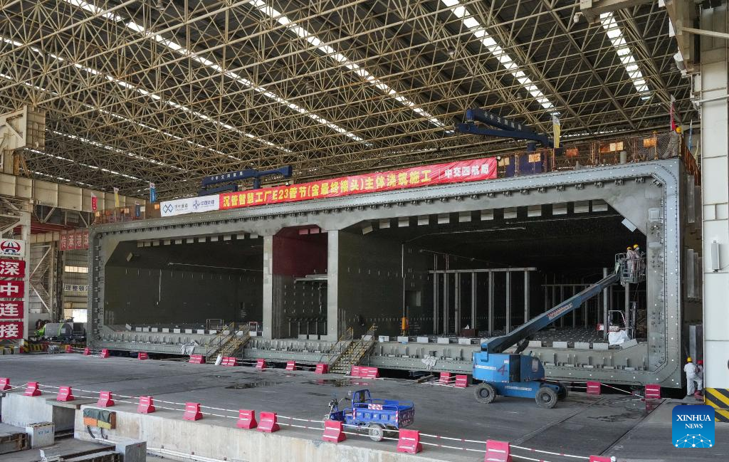 Staff members prepare the outfitting of immersed tube E23 of Shenzhen-Zhongshan highway underwater tunnel at an immersed tube smart factory of CCCC Fourth Harbour Engineering Co., Ltd. on Niutou Island, Zhuhai, south China's Guangdong Province, Jan. 30, 2023. (Xinhua/Liu Dawei)