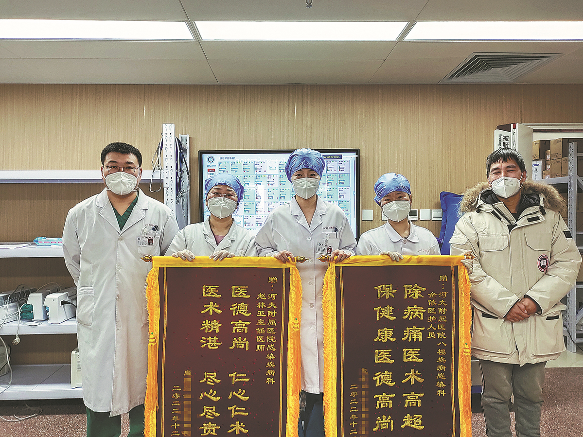 Medical staff members at the hospital display banners showing a patient's gratitude. CHINA DAILY