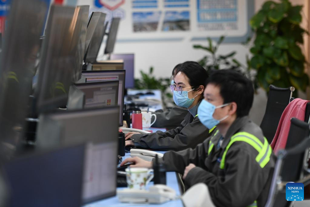 Staff members work at the control center of Beilun No. 3 Container Terminal Co., Ltd. of Ningbo Zhoushan Port in east China's Zhejiang Province, Jan. 31, 2023. (Xinhua/Huang Zongzhi)