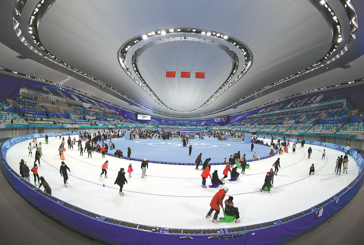 Skaters take to the ice at the National Speed Skating Oval, or Ice Ribbon, in Beijing on Jan 26. Beijing 2022 Winter Olympics organizers are preparing events on Saturday to mark the anniversary of the Games' opening. JIA TIANYONG/CHINA NEWS SERVICE