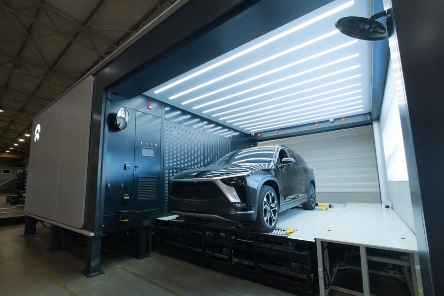 A NIO electric car is seen in a battery swap station during a ceremony of the shipment of the first battery swap station produced by the NIO Power Europe Plant in Biatorbagy, Hungary, on Sept. 16, 2022. (Photo by Attila Volgyi/Xinhua)