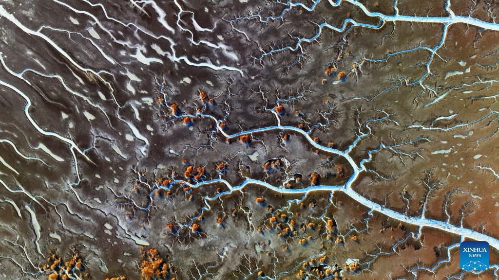 This aerial photo taken on Feb. 1, 2023 shows a view of frozen tidal creeks in the wetland of Liaohe River estuary in Panjin, northeast China's Liaoning Province. (Xinhua/Yang Qing)