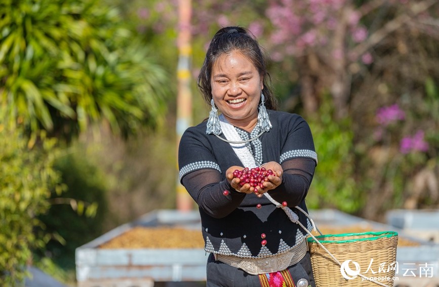 Photos shows a coffee farmer presenting coffee beans in Menglian Dai, Lahu and Wa autonomous county, Pu’er, southwest China’s Yunnan Province. (People’s Daily Online/Hu Zunhui)