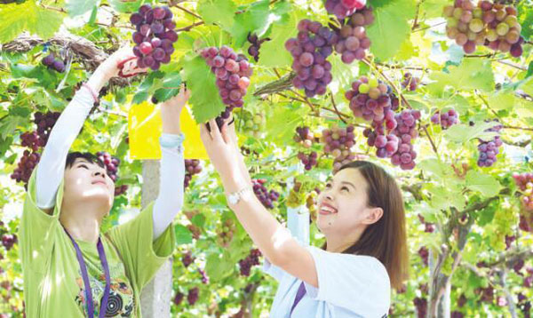 Tourists pick grapes in Pujiang county of Jinhua city, east China's Zhejiang Province. (Photo/www.zjol.com.cn)