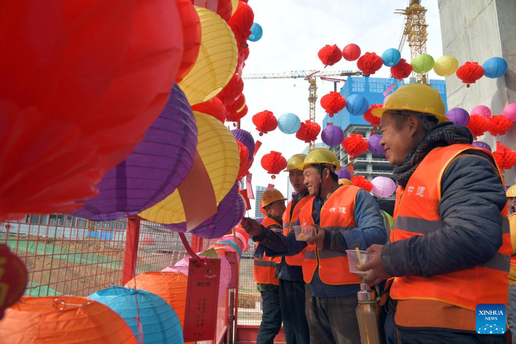 Workers solve lantern riddles at a construction site in Jinan, east China's Shandong Province, Feb. 2, 2023. (Xinhua/Zhu Zheng)