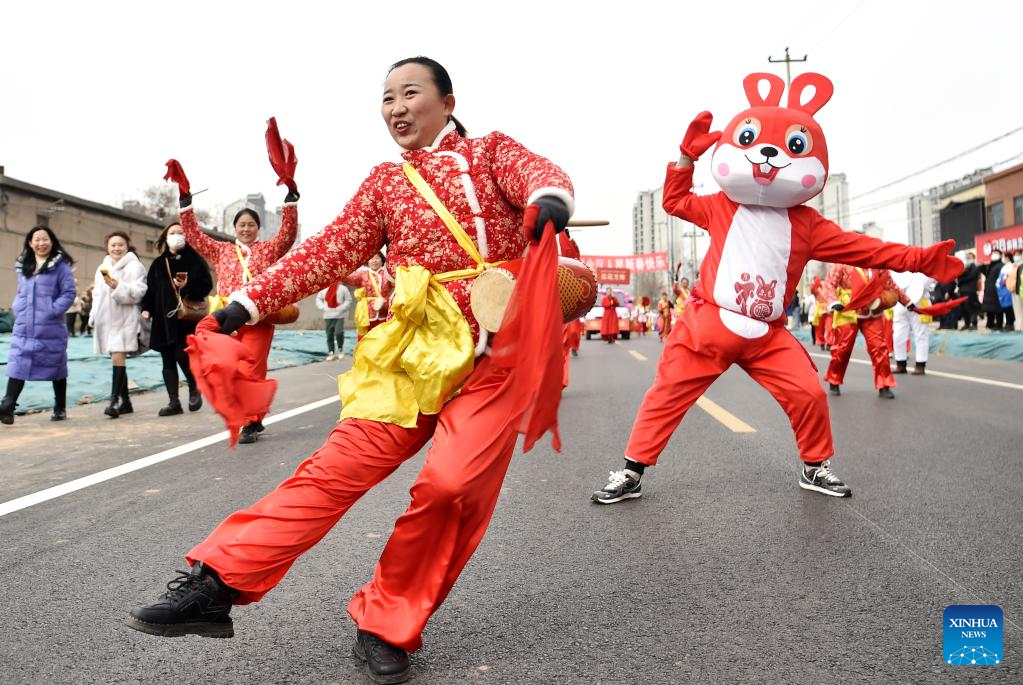 Members of a waist drum team perform during a folk activity in Shijiazhuang City, north China's Hebei Province, Feb. 2, 2023. (Photo by Zhang Xiaofeng/Xinhua)