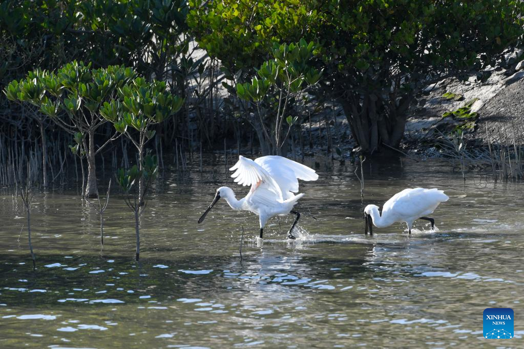Black-faced spoonbills forage at a mangrove wetland in Futian, Shenzhen, south China's Guangdong Province, Feb. 1, 2023. (Xinhua/Liang Xu)