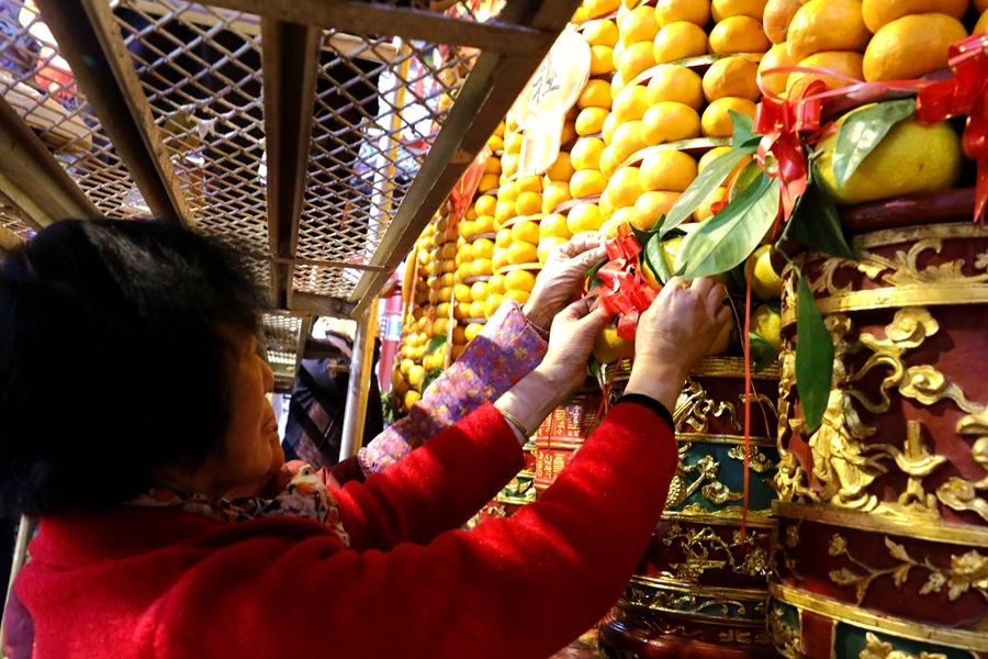 On Jan. 24, 2023, the third day of the first lunar month, Jiangdong villagers were busy piling up oranges in Pukou Palace, a local custom in which they pray for blessings, safety and good fortune in the New Year. The orange pagoda originates from the fruit shrine that was built as a tribute to Imperial Consort Mei of the Tang Dynasty (618-907), whose hometown was Jiangdong village.