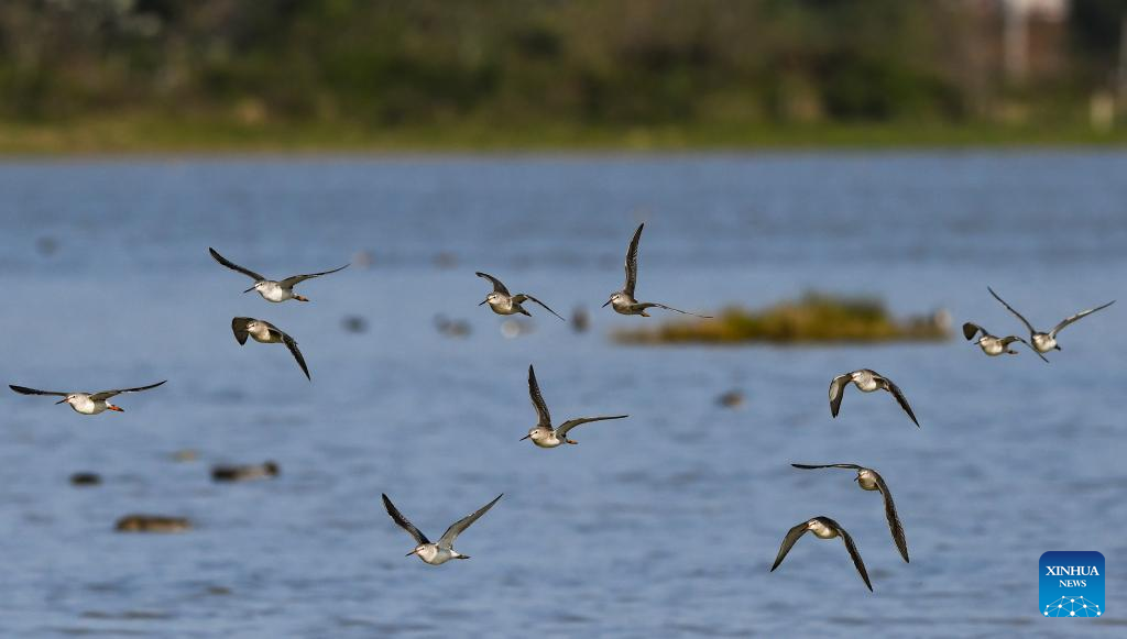 A flock of spotted redshanks are observed in Dongzhaigang National Nature Reserve in south China's Hainan Province, Jan. 30, 2023. February 2 marks World Wetlands Day. A total of 32,036 water birds of 71 species were observed during a latest annual survey of water birds wintering in Hainan. Among them, 201 black-faced spoonbills were recorded, the highest number since the survey of wintering water birds began in 2003. (Xinhua/Yang Guanyu)