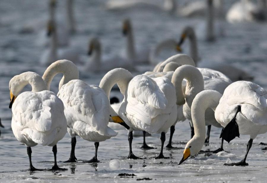 Swans play and rest on the Peacock River in Korla city, northwest China's Xinjiang Uygur autonomous region, Feb 2, 2023. (Photo: China News Service/ Que Hure)