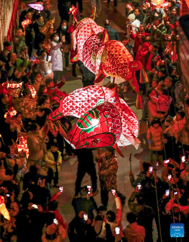 People holding fish-shaped lanterns parade during the new year celebrations in Shexian County of Huangshan City, east China's Anhui Province, Jan. 31, 2023. (Xinhua/Du Yu)