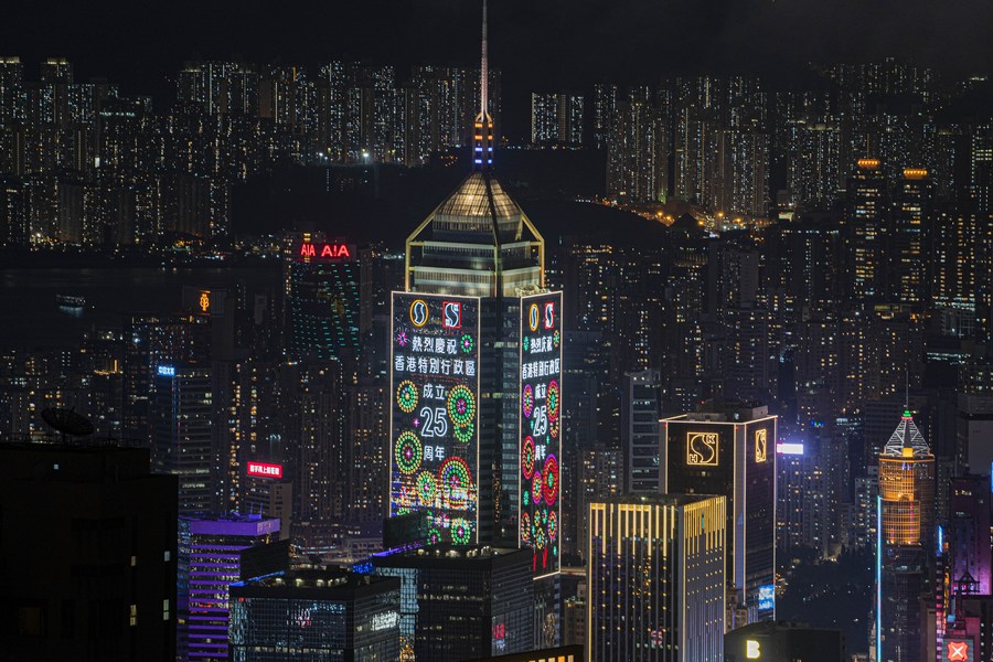 Photo taken on June 22, 2022 shows decorations celebrating the 25th anniversary of the establishment of the Hong Kong Special Administrative Region (HKSAR) in Hong Kong, south China. (Xinhua/Lui Siu Wai)