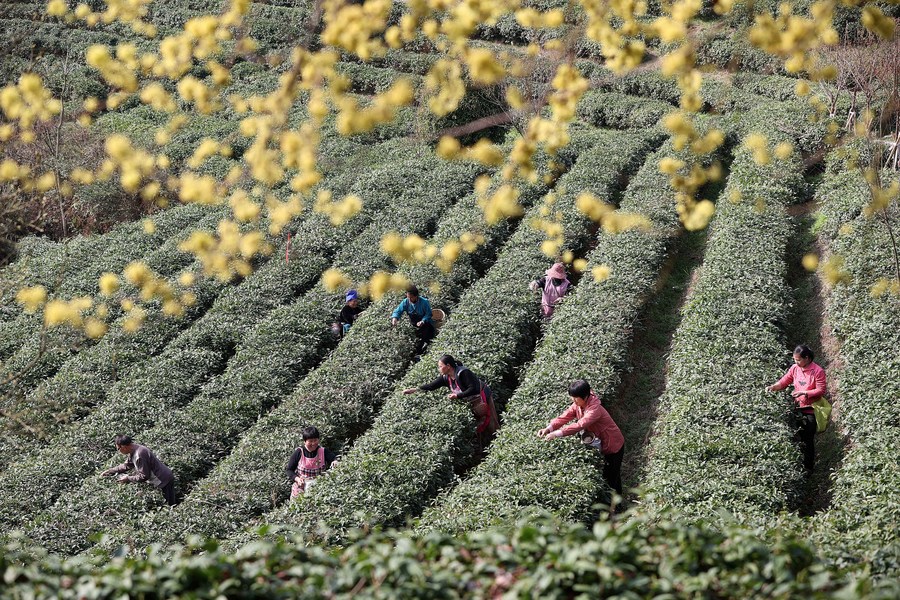 Villagers work in a tea garden in Danzhai County, southwest China's Guizhou Province, March 15, 2022. (Photo by Huang Xiaohai/Xinhua)