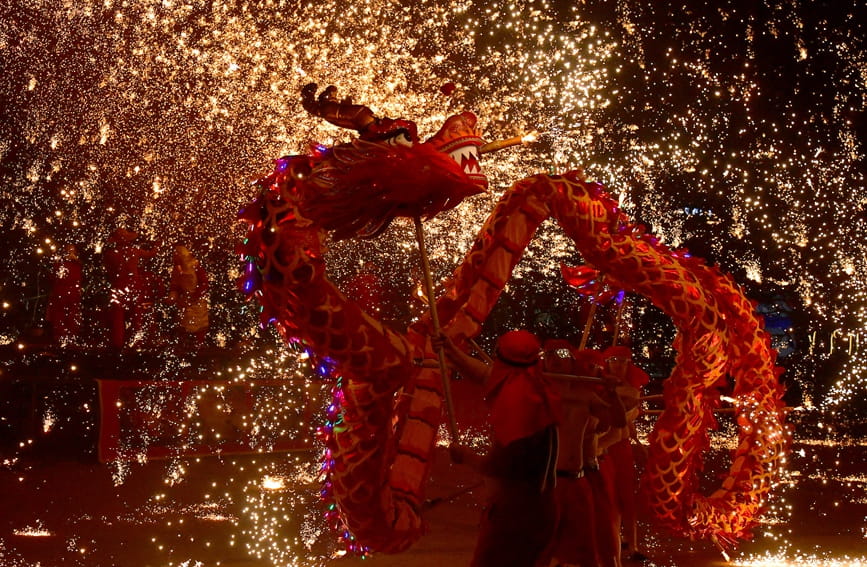 Actors perform datiehua, also known as molten iron splashing, in a temple fair in Luoyang, central China’s Henan Province. (People’s Daily Online/Zhang Guanghui)